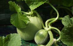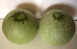 受粉後、約14日、横方向への成長が 進み、まん丸に成長 やがて、メロン特有の網目の源となる ひび割れが出来てくる |